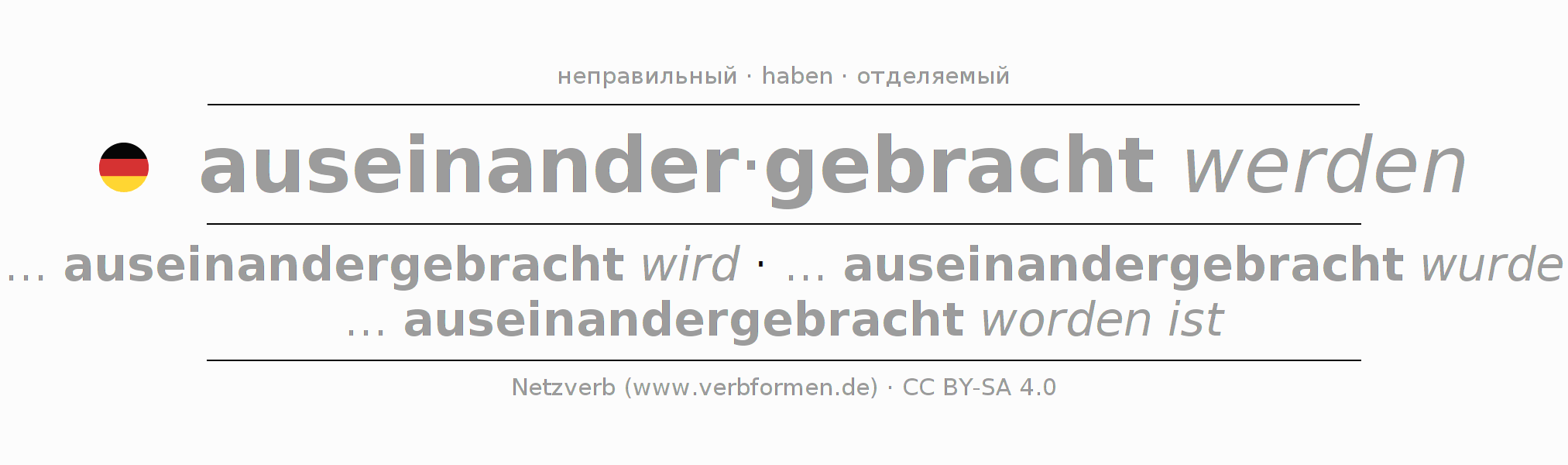 - Инфинитив I: auseinandergebracht werden, auseinandergebracht zu werden