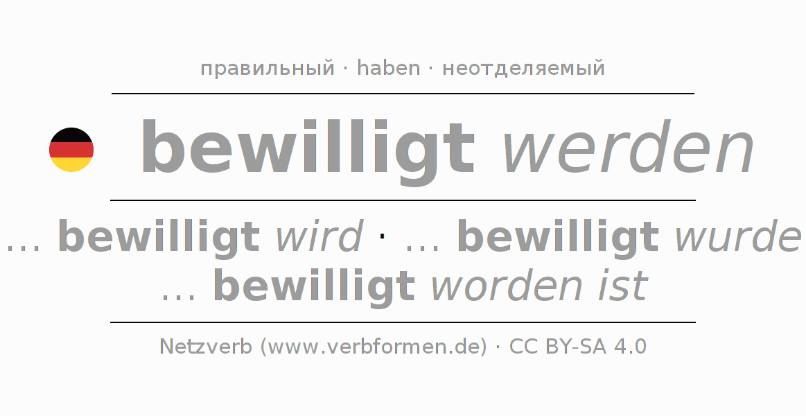 - Презенс: ... ich bewilligt werde, ... du bewilligt wirst, ... er bewilligt wird, ... wir bewilligt werden, ... ihr bewilligt werdet, ... sie bewilligt werden