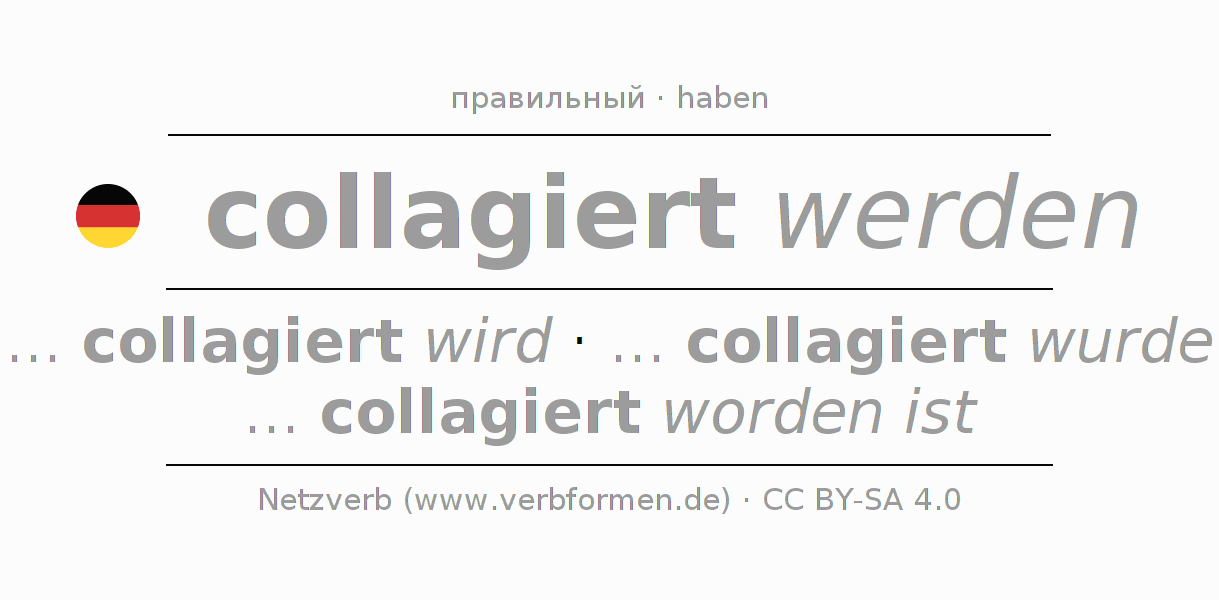 Спряжение глагола collagieren (коллажировать, создавать коллаж) правильное. Формы глагола ... collagiert wird, ... collagiert wurde, ... collagiert worden ist. В качестве вспомогательного глагола к collagieren употребляется "haben". Склоняется в Пассив с werden и употребляется в Придаточное предложение. Для лучшего понимания приводится большое количество примеров употребления глагола collagieren. Для тренировки и закрепления навыков имеются также бесплатные рабочие листы по collagieren. Можно не только collagieren спрягать, но и все немецкие глаголы. Глагол включён в словарный запас обладателя сертификата знания немецкого языка уровня C2. Kомментарии ☆