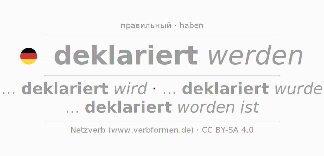 Глагол 'deklariert werden' онлайн как таблица глаголов со всеми наглядно представленными формами. Значение глагола deklariert werden таким образом является помощью для выполнения домашних заданий; подготовки к экзаменам и контрольным работам, а также к урокам немецкого языка; для обучения в вузах и при получении образования для взрослых. Именно для изучающих немецкий язык – правильное спряжение глаголов (... deklariert wird - ... deklariert wurde - ... deklariert worden ist) является решающим фактором.