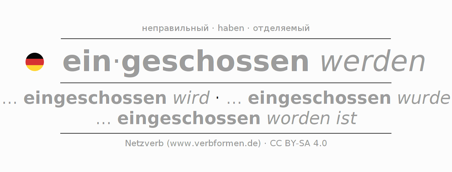 - Инфинитив I: eingeschossen werden, eingeschossen zu werden