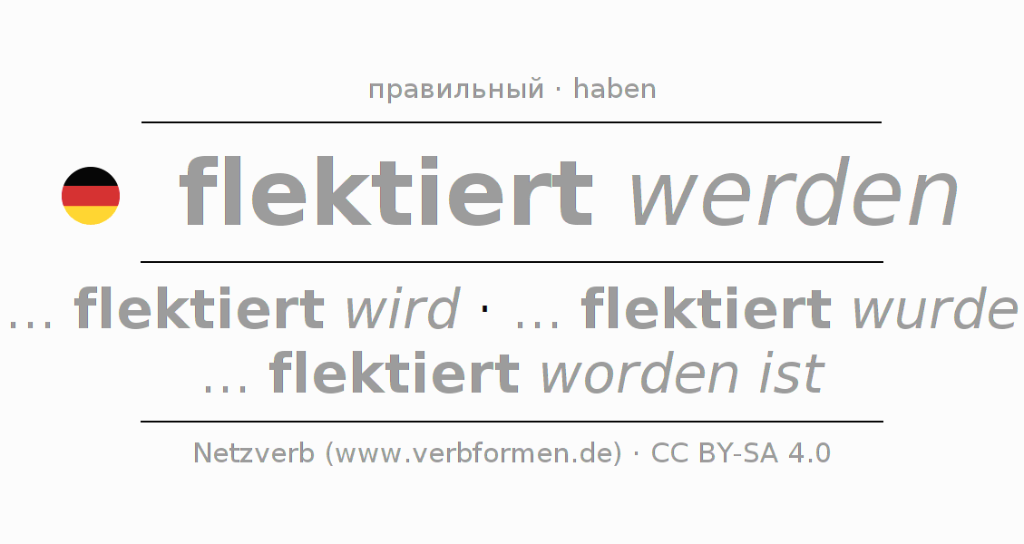 Глагол 'flektiert werden' онлайн как таблица глаголов со всеми наглядно представленными формами. Значение глагола flektiert werden таким образом является помощью для выполнения домашних заданий; подготовки к экзаменам и контрольным работам, а также к урокам немецкого языка; для обучения в вузах и при получении образования для взрослых. Именно для изучающих немецкий язык – правильное спряжение глаголов (... flektiert wird - ... flektiert wurde - ... flektiert worden ist) является решающим фактором.