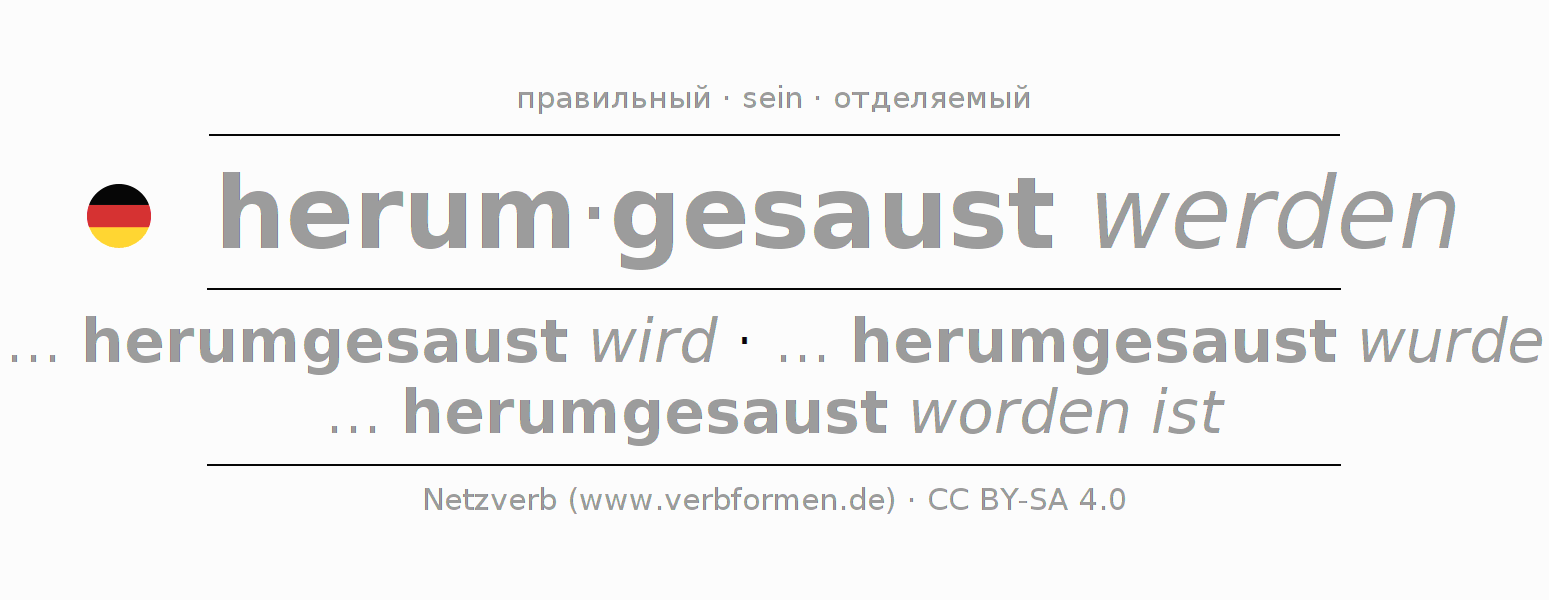- Презенс: ... ich herumgesaust werde, ... du herumgesaust wirst, ... er herumgesaust wird, ... wir herumgesaust werden, ... ihr herumgesaust werdet, ... sie herumgesaust werden
