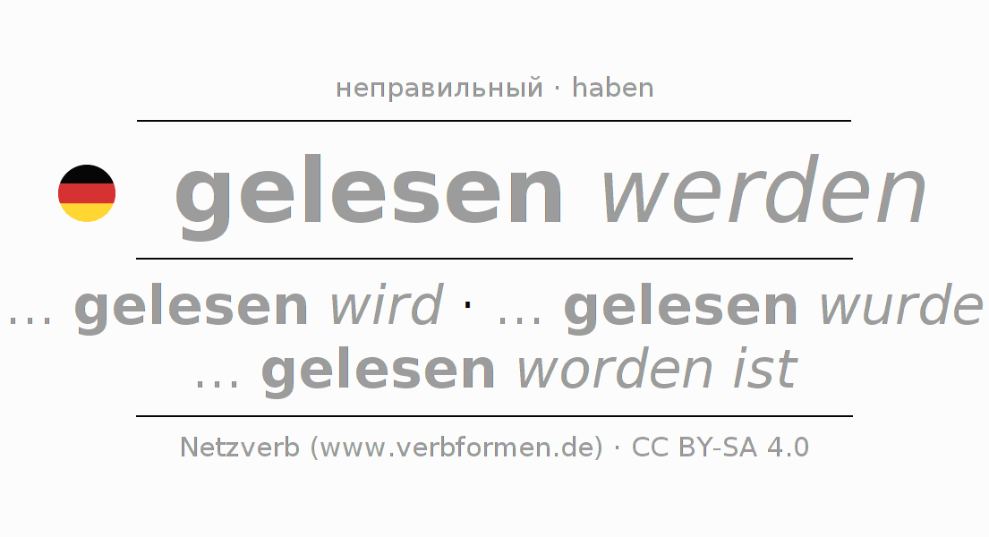 Глагол 'gelesen werden' онлайн как таблица глаголов со всеми наглядно представленными формами. Значение глагола gelesen werden таким образом является помощью для выполнения домашних заданий; подготовки к экзаменам и контрольным работам, а также к урокам немецкого языка; для обучения в вузах и при получении образования для взрослых. Именно для изучающих немецкий язык – правильное спряжение глаголов (... gelesen wird - ... gelesen wurde - ... gelesen worden ist) является решающим фактором.