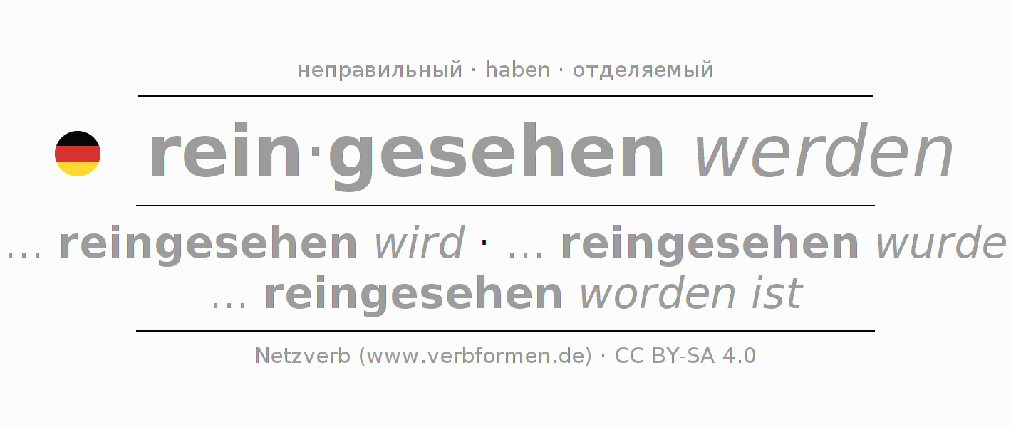 Спряжение глагола reinsehen (взглянуть, заглянуть) неправильное. Формы глагола ... reingesehen wird, ... reingesehen wurde, ... reingesehen worden ist. Чередующиеся гласные e - a - e в корне: В качестве вспомогательного глагола к reinsehen употребляется "haben". Приставка rein- для reinsehen отделяемая. Склоняется в Пассив с werden и употребляется в Придаточное предложение. Для лучшего понимания приводится большое количество примеров употребления глагола reinsehen. Для тренировки и закрепления навыков имеются также бесплатные рабочие листы по reinsehen. Можно не только reinsehen спрягать, но и все немецкие глаголы. Kомментарии ☆