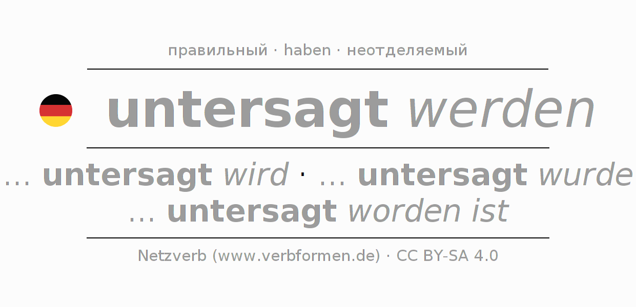 Спряжение глагола untersagen (запретить, запрещать) правильное. Формы глагола ... untersagt wird, ... untersagt wurde, ... untersagt worden ist. В качестве вспомогательного глагола к untersagen употребляется "haben". Приставка unter- для untersagen неотделяемая. Склоняется в Пассив с werden и употребляется в Придаточное предложение. Для лучшего понимания приводится большое количество примеров употребления глагола untersagen. Для тренировки и закрепления навыков имеются также бесплатные рабочие листы по untersagen. Можно не только untersagen спрягать, но и все немецкие глаголы. Глагол включён в словарный запас обладателя сертификата знания немецкого языка уровня C1. Kомментарии ☆