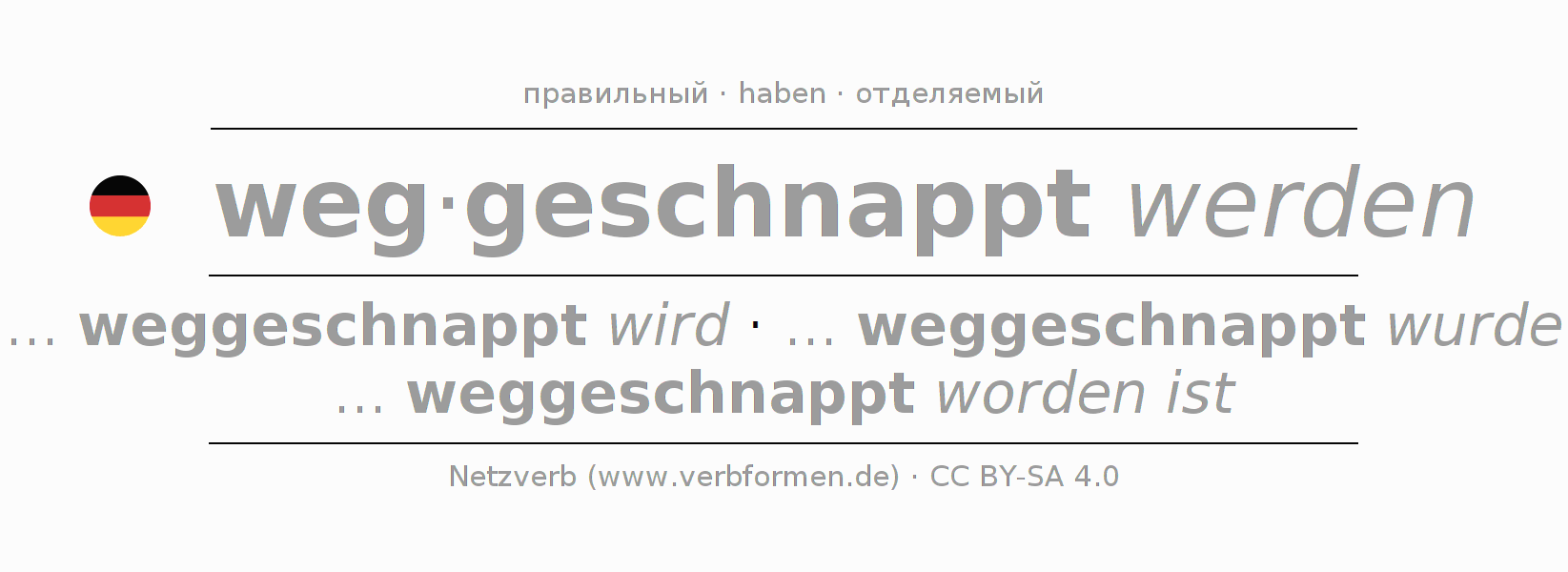- Презенс: ... ich weggeschnappt werde, ... du weggeschnappt wirst, ... er weggeschnappt wird, ... wir weggeschnappt werden, ... ihr weggeschnappt werdet, ... sie weggeschnappt werden