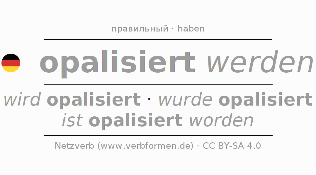 - Перфект: ich bin opalisiert worden, du bist opalisiert worden, er ist opalisiert worden, wir sind opalisiert worden, ihr seid opalisiert worden, sie sind opalisiert worden