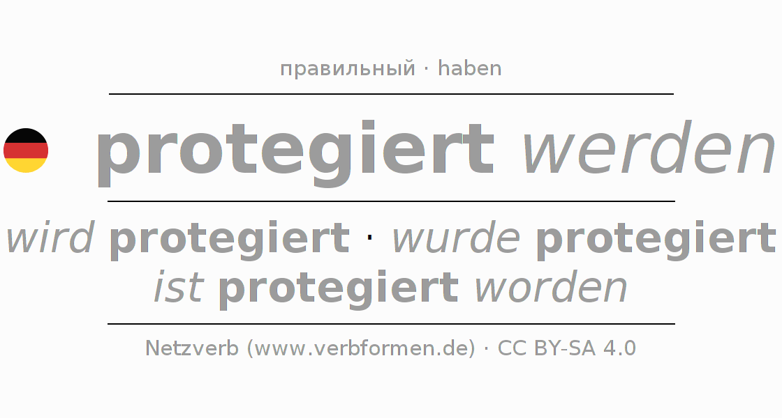 - Презенс: ich werde protegiert, du wirst protegiert, er wird protegiert, wir werden protegiert, ihr werdet protegiert, sie werden protegiert