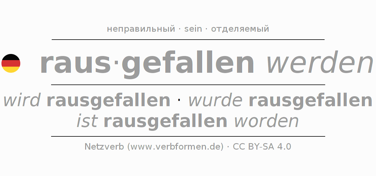 - Презенс: ich werde rausgefallen, du wirst rausgefallen, er wird rausgefallen, wir werden rausgefallen, ihr werdet rausgefallen, sie werden rausgefallen