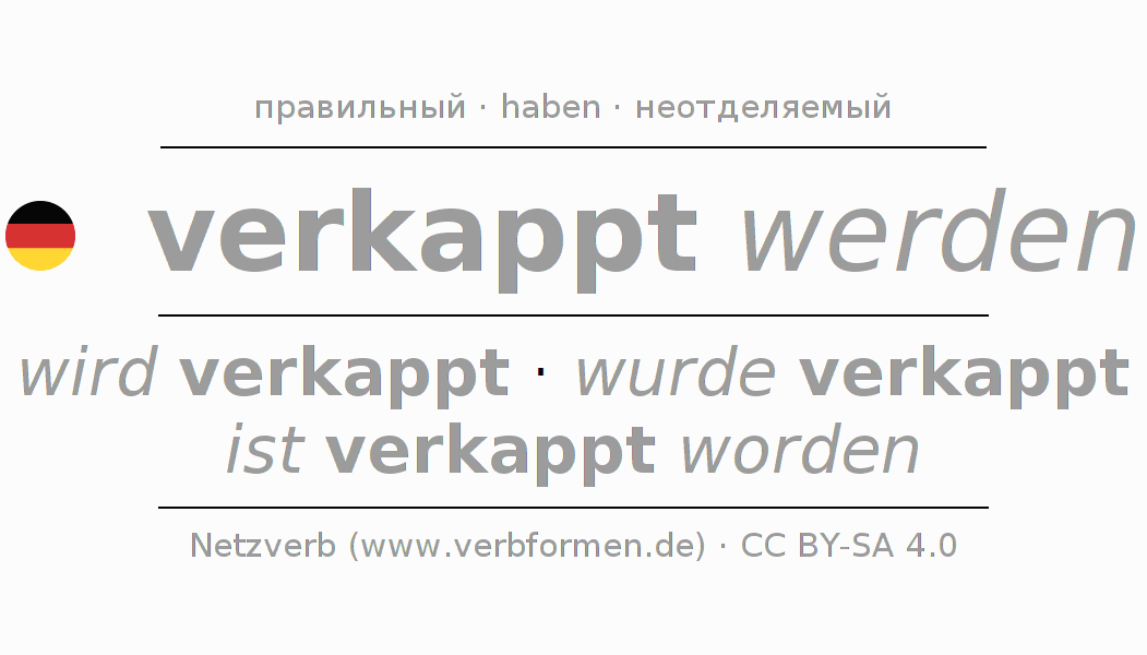 Спряжение глагола verkappen (замаскировать, кепка) правильное. Формы глагола wird verkappt, wurde verkappt, ist verkappt worden. В качестве вспомогательного глагола к verkappen употребляется "haben". Приставка ver- для verkappen неотделяемая. Склоняется в Пассив с werden и употребляется в Главное предложение. Для лучшего понимания приводится большое количество примеров употребления глагола verkappen. Для тренировки и закрепления навыков имеются также бесплатные рабочие листы по verkappen. Можно не только verkappen спрягать, но и все немецкие глаголы. Глагол включён в словарный запас обладателя сертификата знания немецкого языка уровня C2. Kомментарии ☆