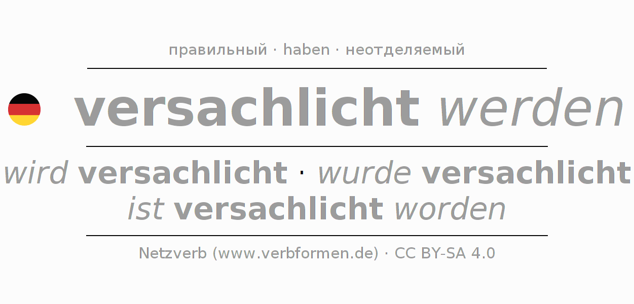 Спряжение глагола versachlichen (объективировать, рационализировать) правильное. Формы глагола wird versachlicht, wurde versachlicht, ist versachlicht worden. В качестве вспомогательного глагола к versachlichen употребляется "haben". Приставка ver- для versachlichen неотделяемая. Склоняется в Пассив с werden и употребляется в Главное предложение. Для лучшего понимания приводится большое количество примеров употребления глагола versachlichen. Для тренировки и закрепления навыков имеются также бесплатные рабочие листы по versachlichen. Можно не только versachlichen спрягать, но и все немецкие глаголы. Глагол включён в словарный запас обладателя сертификата знания немецкого языка уровня C2. Kомментарии ☆