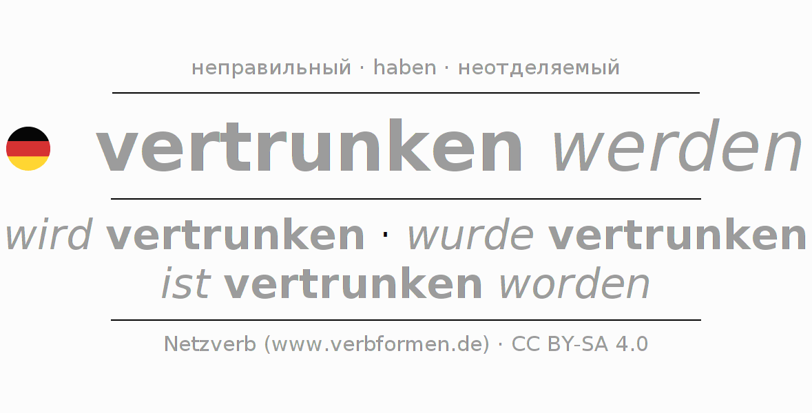 - Инфинитив I: vertrunken werden, vertrunken zu werden