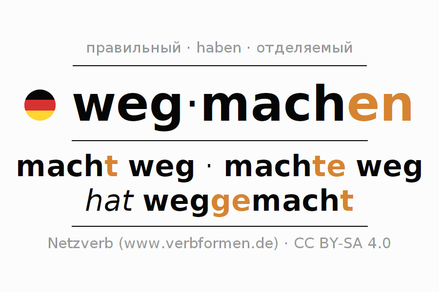 - Презенс: mach(e) (du) weg, machen wir weg, macht (ihr) weg, machen Sie weg