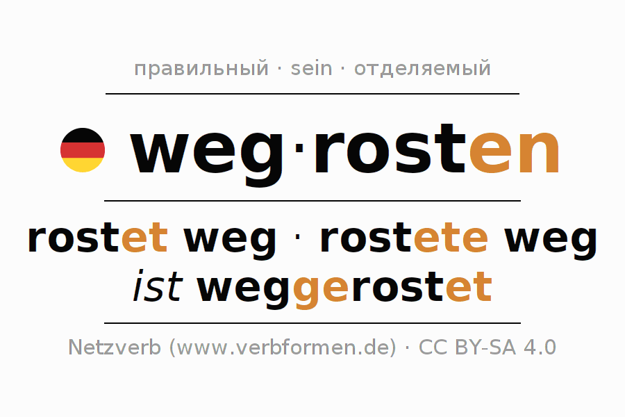 - Презенс: rost(e) (du) weg, rosten wir weg, rostet (ihr) weg, rosten Sie weg