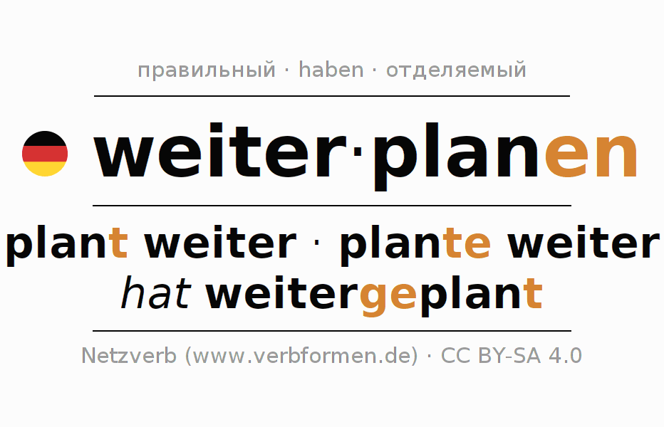 - Презенс: ich plane weiter, du planest weiter, er plane weiter, wir planen weiter, ihr planet weiter, sie planen weiter