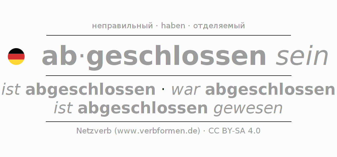 - Перфект: ich bin abgeschlossen gewesen, du bist abgeschlossen gewesen, er ist abgeschlossen gewesen, wir sind abgeschlossen gewesen, ihr seid abgeschlossen gewesen, sie sind abgeschlossen gewesen