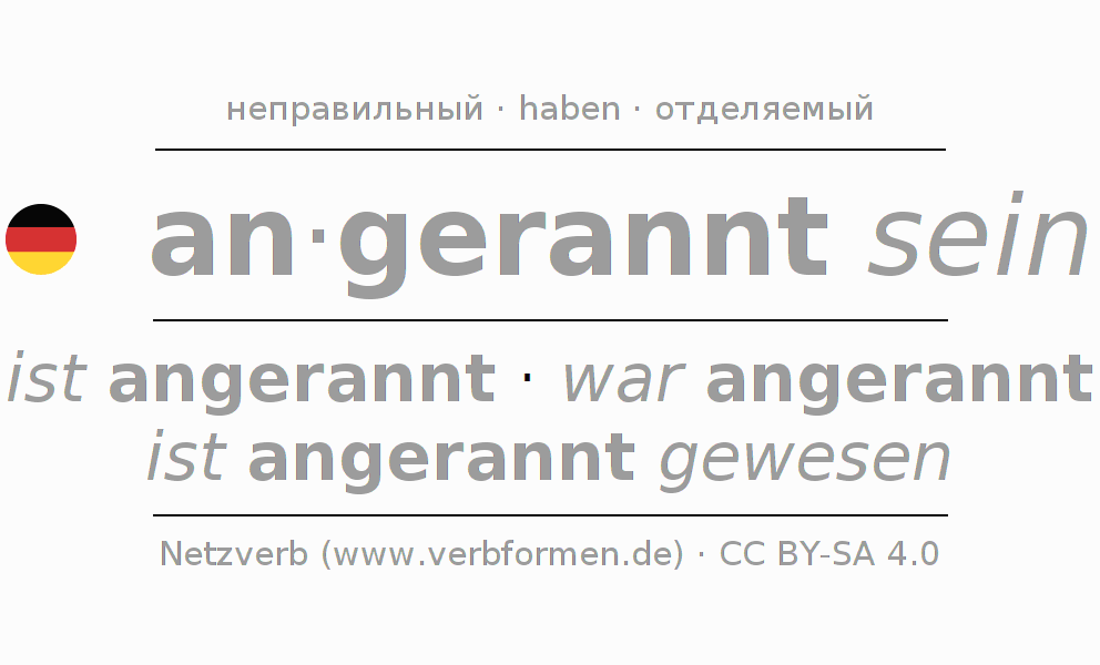 Глагол 'an·gerannt sein' онлайн как таблица глаголов со всеми наглядно представленными формами. Значение глагола an·gerannt sein таким образом является помощью для выполнения домашних заданий; подготовки к экзаменам и контрольным работам, а также к урокам немецкого языка; для обучения в вузах и при получении образования для взрослых. Именно для изучающих немецкий язык – правильное спряжение глаголов (ist angerannt - war angerannt - ist angerannt gewesen) является решающим фактором.