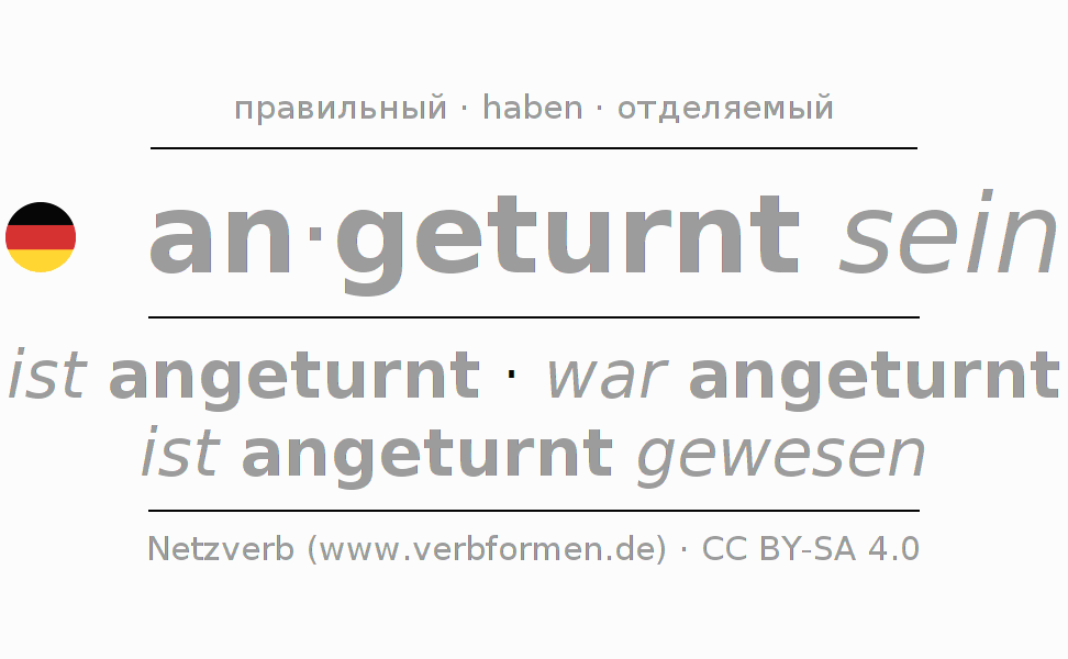 Глагол 'an·geturnt sein' онлайн как таблица глаголов со всеми наглядно представленными формами. Значение глагола an·geturnt sein таким образом является помощью для выполнения домашних заданий; подготовки к экзаменам и контрольным работам, а также к урокам немецкого языка; для обучения в вузах и при получении образования для взрослых. Именно для изучающих немецкий язык – правильное спряжение глаголов (ist angeturnt - war angeturnt - ist angeturnt gewesen) является решающим фактором.