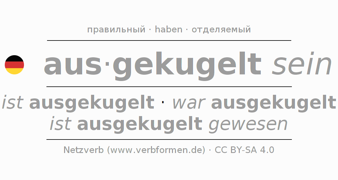 Спряжение глагола auskugeln (вывихнуть, баллотировать) правильное. Формы глагола ist ausgekugelt, war ausgekugelt, ist ausgekugelt gewesen. В качестве вспомогательного глагола к auskugeln употребляется "haben". Приставка aus- для auskugeln отделяемая. Склоняется в Пассив с sein и употребляется в Главное предложение. Для лучшего понимания приводится большое количество примеров употребления глагола auskugeln. Для тренировки и закрепления навыков имеются также бесплатные рабочие листы по auskugeln. Можно не только auskugeln спрягать, но и все немецкие глаголы. Kомментарии ☆