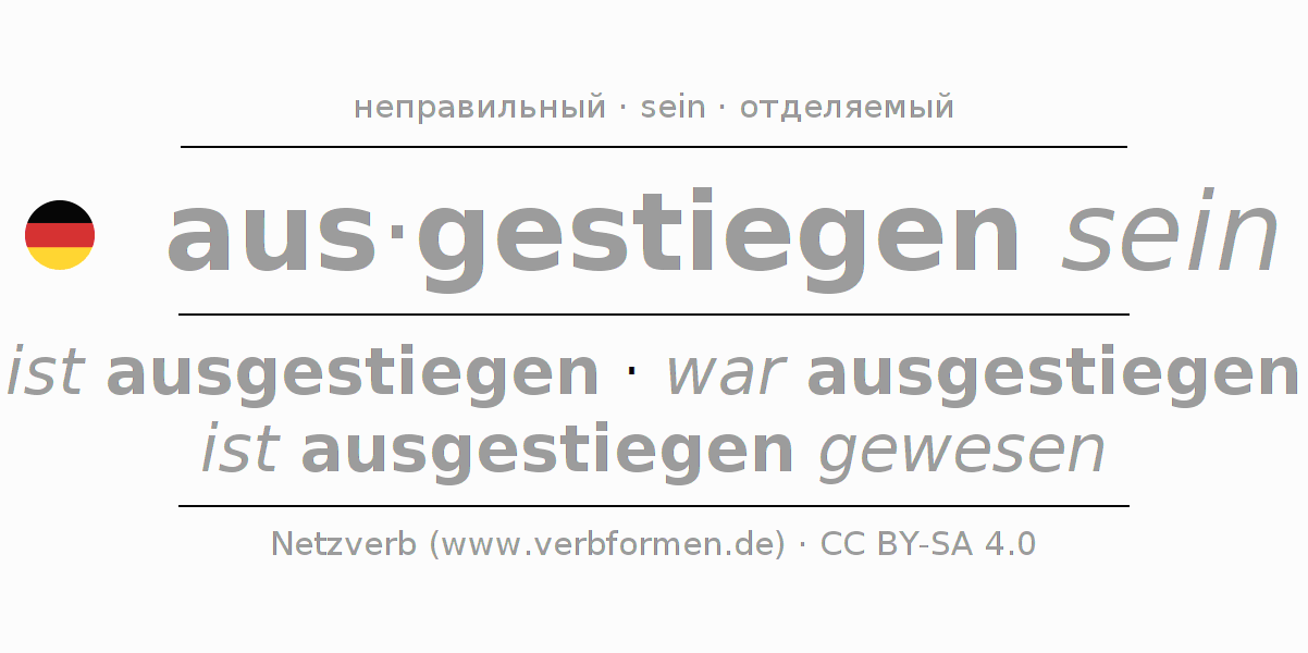 Спряжение глагола aussteigen (выйти, сойти) неправильное. Формы глагола ist ausgestiegen, war ausgestiegen, ist ausgestiegen gewesen. Чередующиеся гласные ei - ie - ie в корне: В качестве вспомогательного глагола к aussteigen употребляется "sein". Приставка aus- для aussteigen отделяемая. Склоняется в Пассив с sein и употребляется в Главное предложение. Для лучшего понимания приводится большое количество примеров употребления глагола aussteigen. Для тренировки и закрепления навыков имеются также бесплатные рабочие листы по aussteigen. Можно не только aussteigen спрягать, но и все немецкие глаголы. Глагол включён в словарный запас обладателя сертификата знания немецкого языка уровня A1. Kомментарии ☆