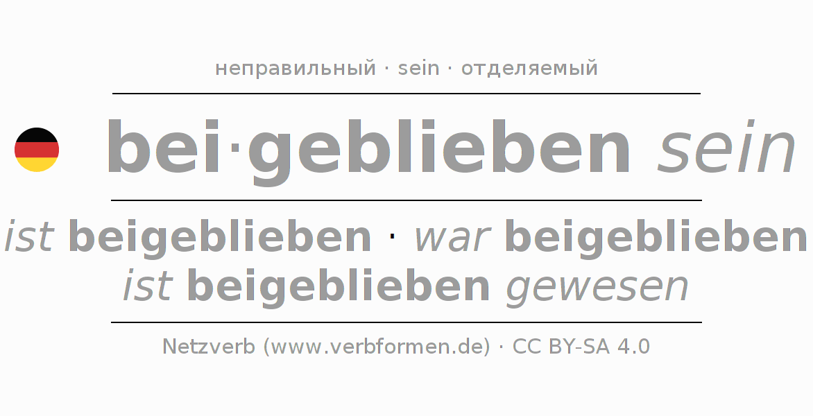 - Перфект: ich bin beigeblieben gewesen, du bist beigeblieben gewesen, er ist beigeblieben gewesen, wir sind beigeblieben gewesen, ihr seid beigeblieben gewesen, sie sind beigeblieben gewesen