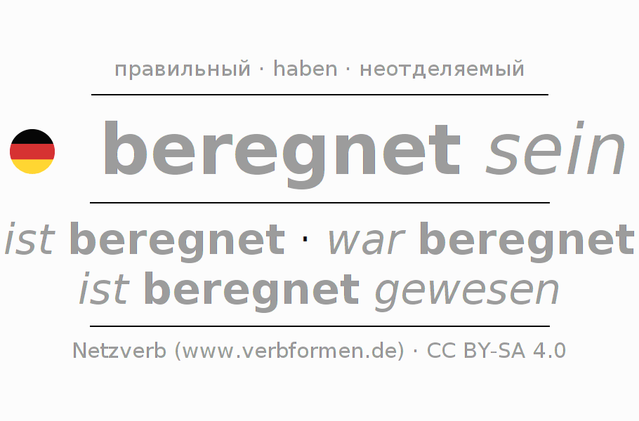 - Претеритум: ich war beregnet, du warst beregnet, er war beregnet, wir waren beregnet, ihr wart beregnet, sie waren beregnet