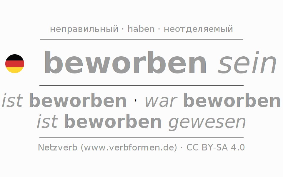 Спряжение глагола bewerben (подать заявление, подавать заявление) неправильное. Формы глагола ist beworben, war beworben, ist beworben gewesen. Чередующиеся гласные e - a - o в корне: В качестве вспомогательного глагола к bewerben употребляется "haben". Глагол bewerben может употребляться в возвратной форме. Приставка be- для bewerben неотделяемая. Склоняется в Пассив с sein и употребляется в Главное предложение. Для лучшего понимания приводится большое количество примеров употребления глагола bewerben. Для тренировки и закрепления навыков имеются также бесплатные рабочие листы по bewerben. Можно не только bewerben спрягать, но и все немецкие глаголы. Глагол включён в словарный запас обладателя сертификата знания немецкого языка уровня A1. Kомментарии ☆