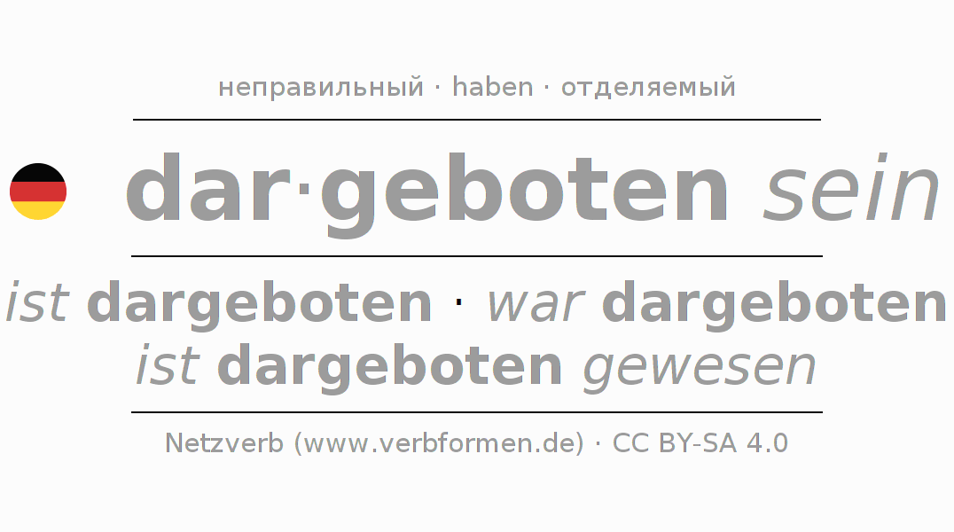 Глагол 'dar·geboten sein' онлайн как таблица глаголов со всеми наглядно представленными формами. Значение глагола dar·geboten sein таким образом является помощью для выполнения домашних заданий; подготовки к экзаменам и контрольным работам, а также к урокам немецкого языка; для обучения в вузах и при получении образования для взрослых. Именно для изучающих немецкий язык – правильное спряжение глаголов (ist dargeboten - war dargeboten - ist dargeboten gewesen) является решающим фактором.