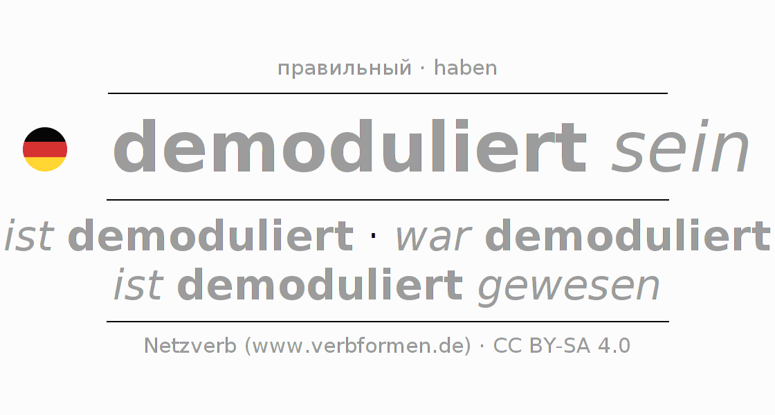 - Презенс: ich bin demoduliert, du bist demoduliert, er ist demoduliert, wir sind demoduliert, ihr seid demoduliert, sie sind demoduliert