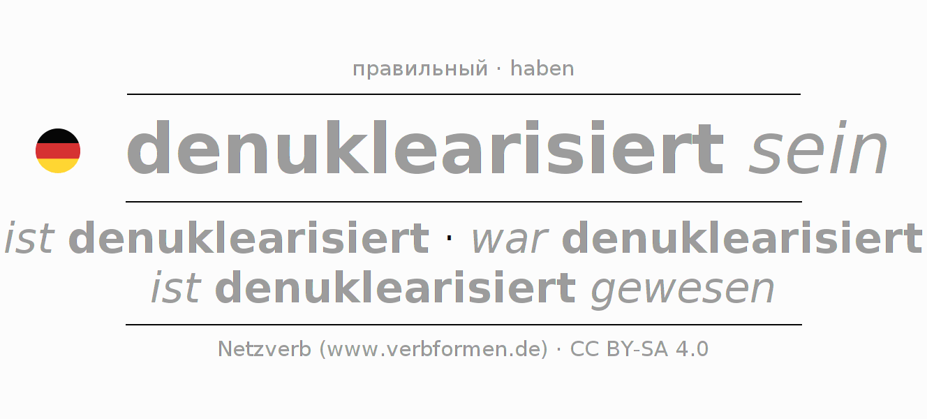 - Презенс: ich bin denuklearisiert, du bist denuklearisiert, er ist denuklearisiert, wir sind denuklearisiert, ihr seid denuklearisiert, sie sind denuklearisiert