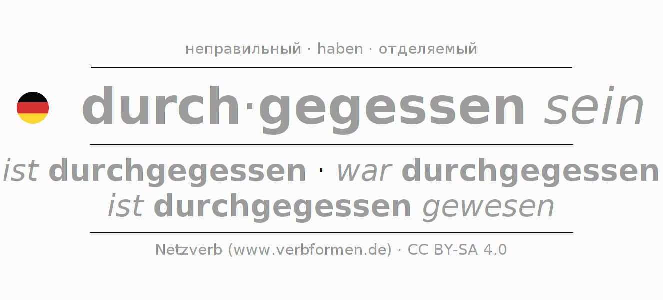 Спряжение глагола durchessen (кормиться, прокормиться) неправильное. Формы глагола ist durchgegessen, war durchgegessen, ist durchgegessen gewesen. Чередующиеся гласные e - a - e в корне: В качестве вспомогательного глагола к durchessen употребляется "haben". Приставка durch- для durchessen отделяемая. Склоняется в Пассив с sein и употребляется в Главное предложение. Для лучшего понимания приводится большое количество примеров употребления глагола durchessen. Для тренировки и закрепления навыков имеются также бесплатные рабочие листы по durchessen. Можно не только durchessen спрягать, но и все немецкие глаголы. Глагол включён в словарный запас обладателя сертификата знания немецкого языка уровня C2. Kомментарии ☆