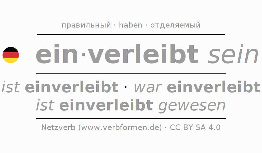 - Презенс: ich bin einverleibt, du bist einverleibt, er ist einverleibt, wir sind einverleibt, ihr seid einverleibt, sie sind einverleibt