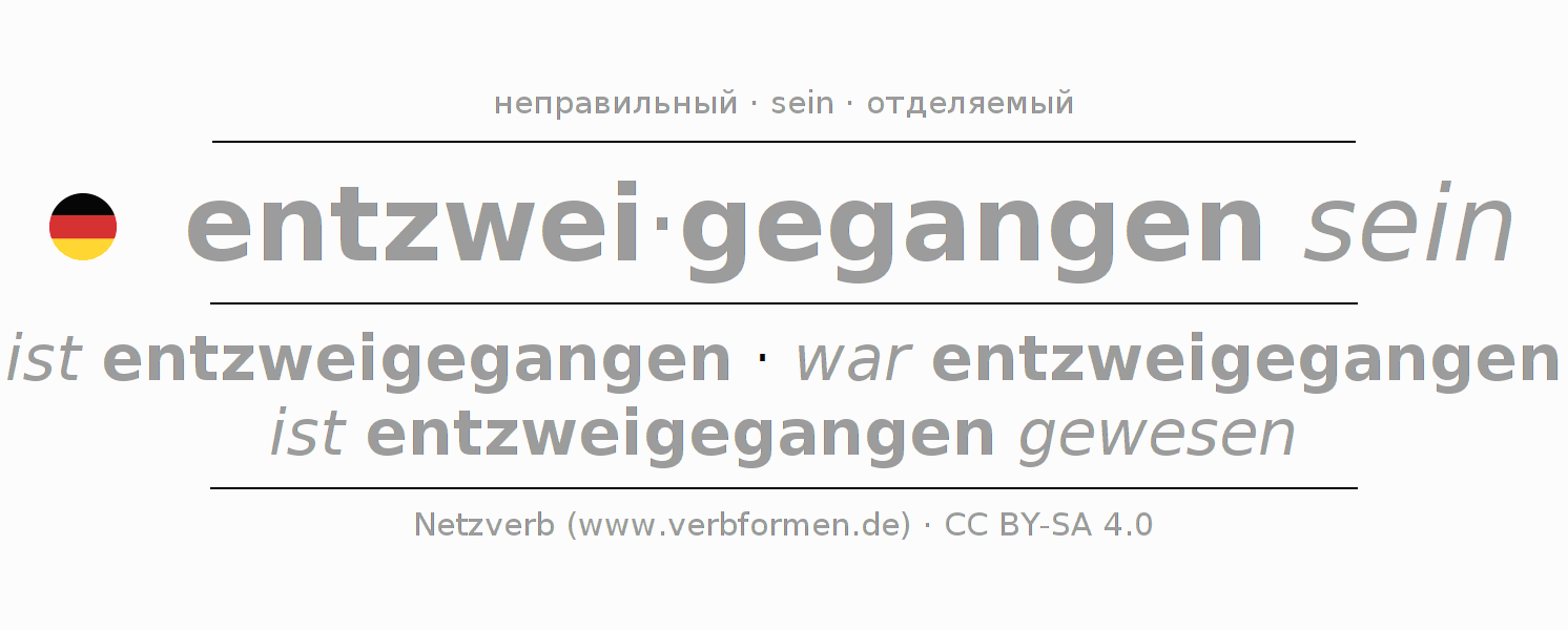 - Перфект: ich bin entzweigegangen gewesen, du bist entzweigegangen gewesen, er ist entzweigegangen gewesen, wir sind entzweigegangen gewesen, ihr seid entzweigegangen gewesen, sie sind entzweigegangen gewesen