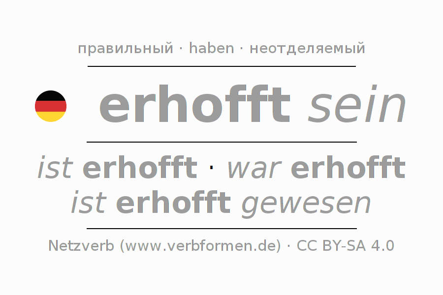 Спряжение глагола erhoffen (ожидать, надеяться) правильное. Формы глагола ist erhofft, war erhofft, ist erhofft gewesen. В качестве вспомогательного глагола к erhoffen употребляется "haben". Приставка er- для erhoffen неотделяемая. Склоняется в Пассив с sein и употребляется в Главное предложение. Для лучшего понимания приводится большое количество примеров употребления глагола erhoffen. Для тренировки и закрепления навыков имеются также бесплатные рабочие листы по erhoffen. Можно не только erhoffen спрягать, но и все немецкие глаголы. Глагол включён в словарный запас обладателя сертификата знания немецкого языка уровня B2. Kомментарии ☆
