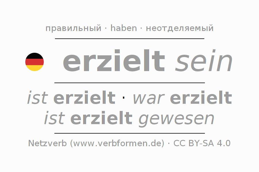 Спряжение глагола erzielen (достигать, добиваться) правильное. Формы глагола ist erzielt, war erzielt, ist erzielt gewesen. В качестве вспомогательного глагола к erzielen употребляется "haben". Приставка er- для erzielen неотделяемая. Склоняется в Пассив с sein и употребляется в Главное предложение. Для лучшего понимания приводится большое количество примеров употребления глагола erzielen. Для тренировки и закрепления навыков имеются также бесплатные рабочие листы по erzielen. Можно не только erzielen спрягать, но и все немецкие глаголы. Глагол включён в словарный запас обладателя сертификата знания немецкого языка уровня B1. Kомментарии ☆
