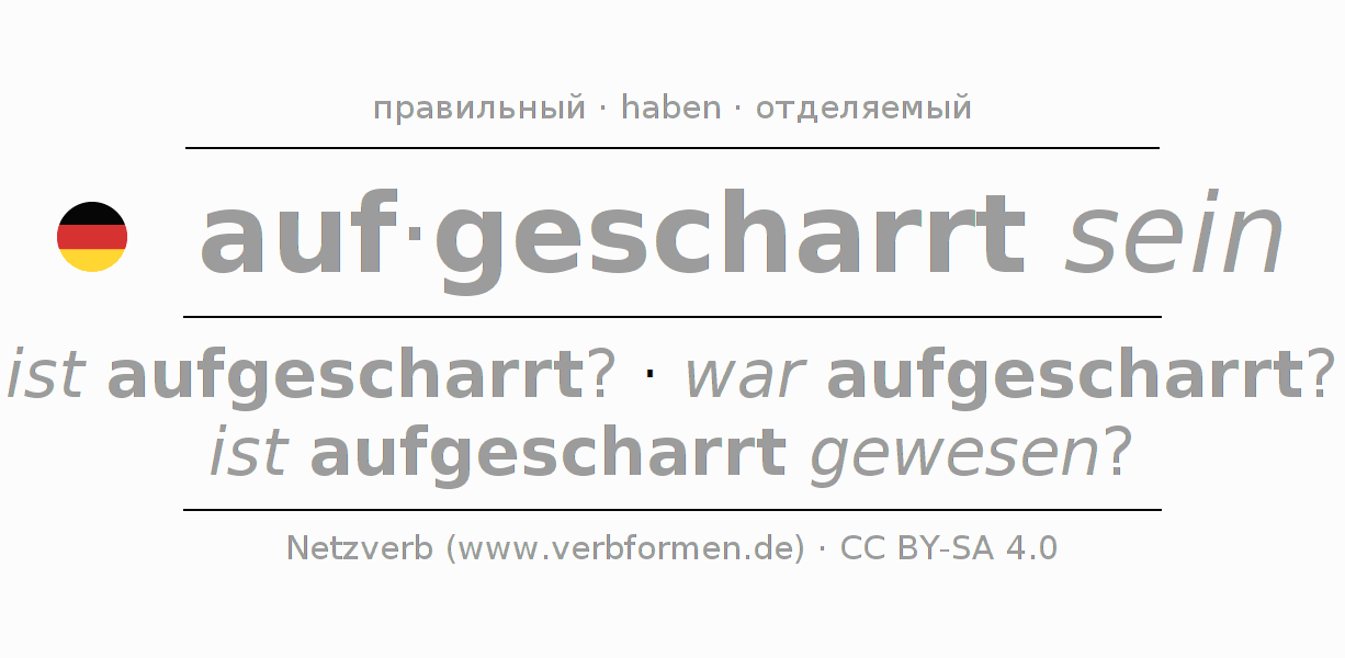 - Презенс: bin ich aufgescharrt?, bist du aufgescharrt?, ist er aufgescharrt?, sind wir aufgescharrt?, seid ihr aufgescharrt?, sind sie aufgescharrt?