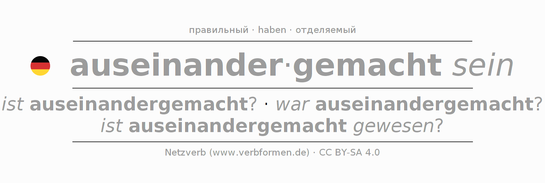 - Инфинитив I: auseinandergemacht sein, auseinandergemacht zu sein