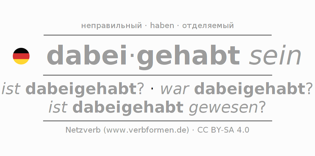 Спряжение глагола dabeihaben (иметь при себе, иметь с собой) неправильное. Формы глагола ist dabeigehabt?, war dabeigehabt?, ist dabeigehabt gewesen?. В качестве вспомогательного глагола к dabeihaben употребляется "haben". Приставка dabei- для dabeihaben отделяемая. Склоняется в Пассив с sein и употребляется в Вопросительное предложение. Для лучшего понимания приводится большое количество примеров употребления глагола dabeihaben. Для тренировки и закрепления навыков имеются также бесплатные рабочие листы по dabeihaben. Можно не только dabeihaben спрягать, но и все немецкие глаголы. Глагол включён в словарный запас обладателя сертификата знания немецкого языка уровня B1. Kомментарии ☆