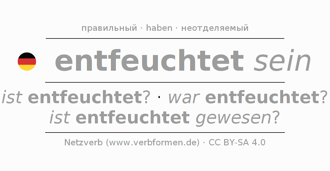 - Презенс: sei ich entfeuchtet?, seiest du entfeuchtet?, sei er entfeuchtet?, seien wir entfeuchtet?, seiet ihr entfeuchtet?, seien sie entfeuchtet?