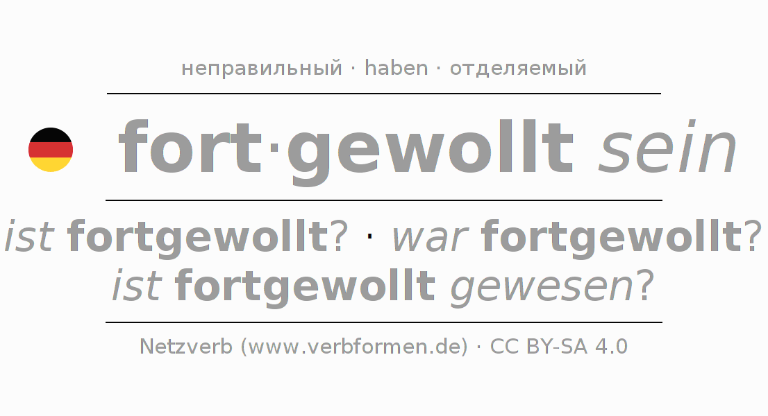 - Презенс: bin ich fortgewollt?, bist du fortgewollt?, ist er fortgewollt?, sind wir fortgewollt?, seid ihr fortgewollt?, sind sie fortgewollt?
