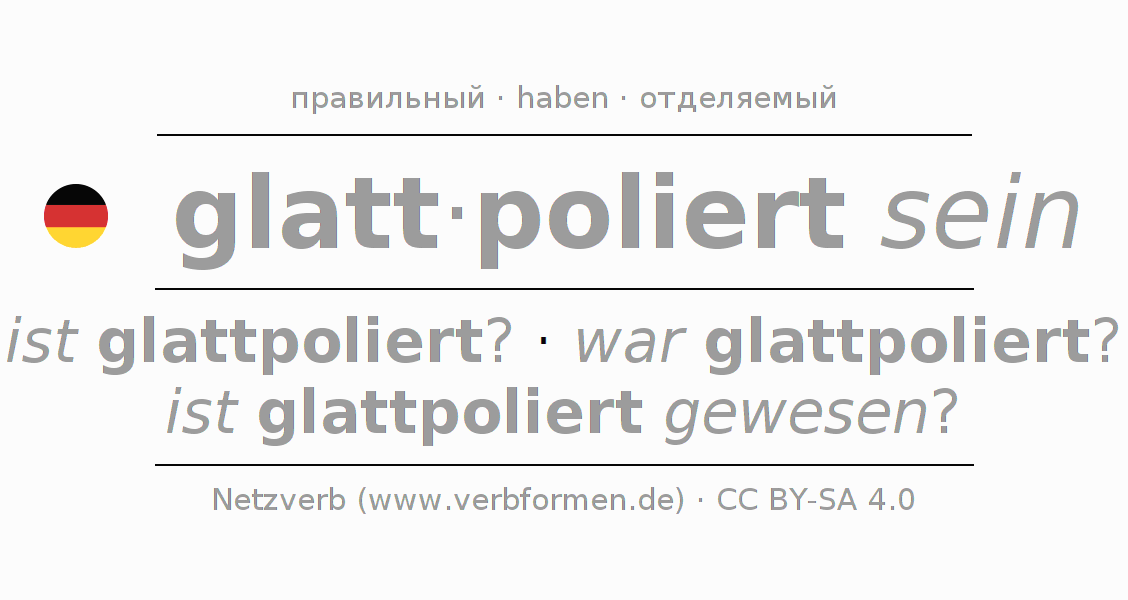 Спряжение глагола glattpolieren (гладить, полировать) правильное. Формы глагола ist glattpoliert?, war glattpoliert?, ist glattpoliert gewesen?. В качестве вспомогательного глагола к glattpolieren употребляется "haben". Приставка glatt- для glattpolieren отделяемая. Склоняется в Пассив с sein и употребляется в Вопросительное предложение. Для лучшего понимания приводится большое количество примеров употребления глагола glattpolieren. Для тренировки и закрепления навыков имеются также бесплатные рабочие листы по glattpolieren. Можно не только glattpolieren спрягать, но и все немецкие глаголы. Kомментарии ☆