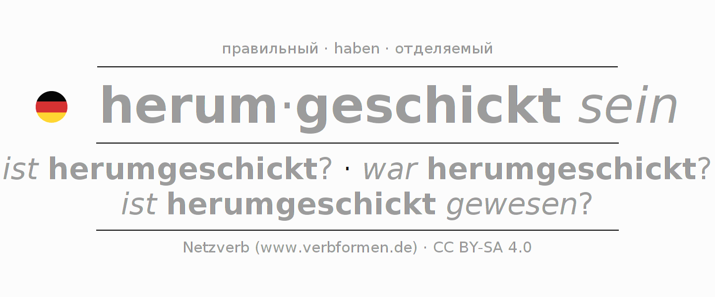 Глагол 'herum·geschickt sein' онлайн как таблица глаголов со всеми наглядно представленными формами. Значение глагола herum·geschickt sein таким образом является помощью для выполнения домашних заданий; подготовки к экзаменам и контрольным работам, а также к урокам немецкого языка; для обучения в вузах и при получении образования для взрослых. Именно для изучающих немецкий язык – правильное спряжение глаголов (ist herumgeschickt? - war herumgeschickt? - ist herumgeschickt gewesen?) является решающим фактором.