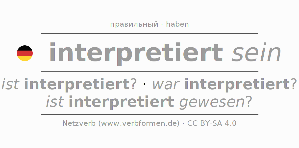 - Презенс: sei ich interpretiert?, seiest du interpretiert?, sei er interpretiert?, seien wir interpretiert?, seiet ihr interpretiert?, seien sie interpretiert?