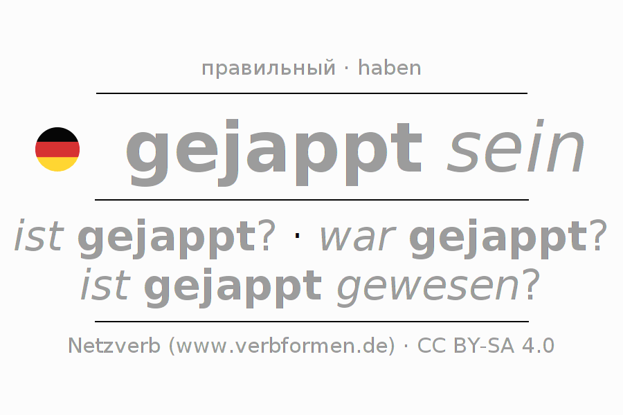 Спряжение глагола jappen (задыхаться, запыхаться) правильное. Формы глагола ist gejappt?, war gejappt?, ist gejappt gewesen?. В качестве вспомогательного глагола к jappen употребляется "haben". Склоняется в Пассив с sein и употребляется в Вопросительное предложение. Для лучшего понимания приводится большое количество примеров употребления глагола jappen. Для тренировки и закрепления навыков имеются также бесплатные рабочие листы по jappen. Можно не только jappen спрягать, но и все немецкие глаголы. Kомментарии ☆