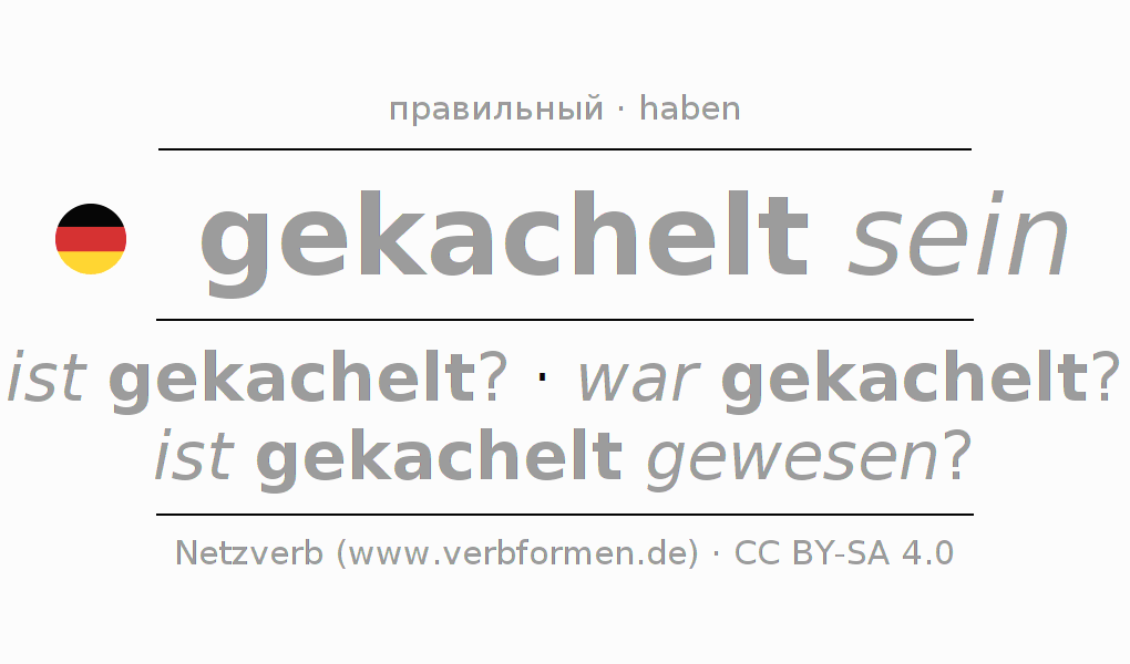Спряжение глагола kacheln (облицовывать плиткой, облицевать кафелем) правильное. Формы глагола ist gekachelt?, war gekachelt?, ist gekachelt gewesen?. В качестве вспомогательного глагола к kacheln употребляется "haben". Однако имеются временные формы со вспомогательным глаголом sein. Склоняется в Пассив с sein и употребляется в Вопросительное предложение. Для лучшего понимания приводится большое количество примеров употребления глагола kacheln. Для тренировки и закрепления навыков имеются также бесплатные рабочие листы по kacheln. Можно не только kacheln спрягать, но и все немецкие глаголы. Глагол включён в словарный запас обладателя сертификата знания немецкого языка уровня C2. Kомментарии ☆