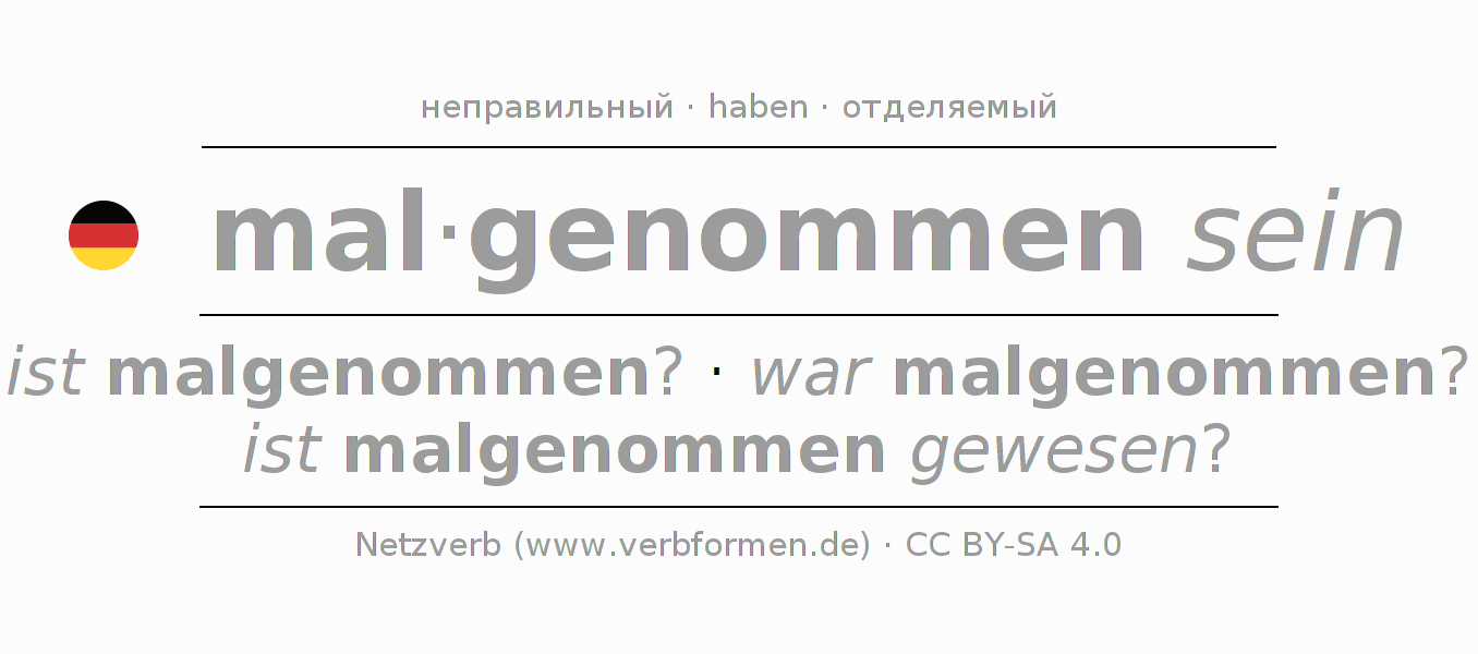 - Презенс: bin ich malgenommen?, bist du malgenommen?, ist er malgenommen?, sind wir malgenommen?, seid ihr malgenommen?, sind sie malgenommen?