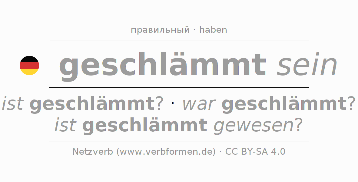 - Презенс: sei ich geschlämmt?, seiest du geschlämmt?, sei er geschlämmt?, seien wir geschlämmt?, seiet ihr geschlämmt?, seien sie geschlämmt?