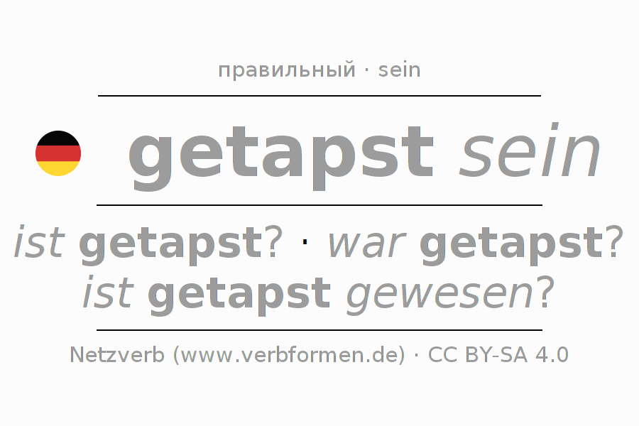 Глагол 'getapst sein' онлайн как таблица глаголов со всеми наглядно представленными формами. Значение глагола getapst sein таким образом является помощью для выполнения домашних заданий; подготовки к экзаменам и контрольным работам, а также к урокам немецкого языка; для обучения в вузах и при получении образования для взрослых. Именно для изучающих немецкий язык – правильное спряжение глаголов (ist getapst? - war getapst? - ist getapst gewesen?) является решающим фактором.