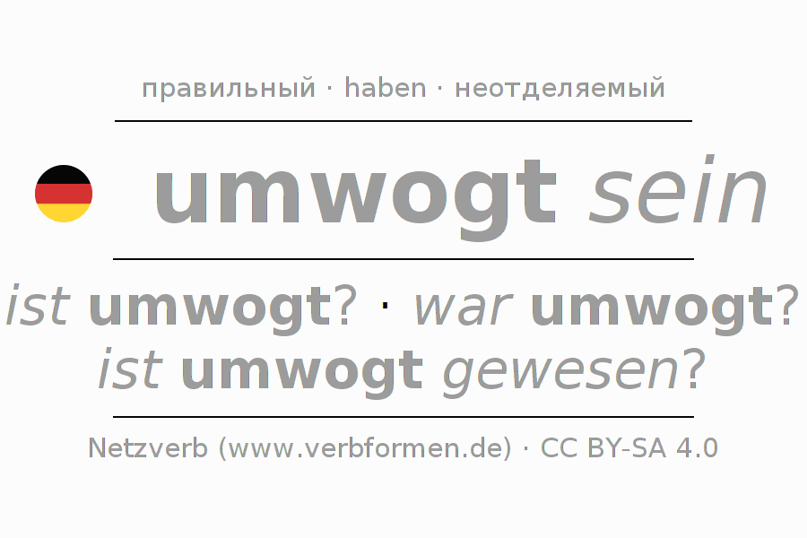 Спряжение глагола umwogen (окружать, обвивать) правильное. Формы глагола ist umwogt?, war umwogt?, ist umwogt gewesen?. В качестве вспомогательного глагола к umwogen употребляется "haben". Приставка um- для umwogen неотделяемая. Склоняется в Пассив с sein и употребляется в Вопросительное предложение. Для лучшего понимания приводится большое количество примеров употребления глагола umwogen. Для тренировки и закрепления навыков имеются также бесплатные рабочие листы по umwogen. Можно не только umwogen спрягать, но и все немецкие глаголы. Kомментарии ☆